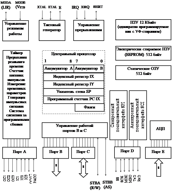 Функция: Y1=f1(X1; X2; X3;X4) t1=60 мкс. __ Y1=X1 & X2 & X3 vX4 Функция: NU= f2(NU1, NU2, K) NU= (NU1- NU2*K) t2=90мкс. t3=40мкс. 1. Структура и описание микроЭВМ Общая структура разрабатываемого МПУ: Изготовленный по КМОП-технологии с высокоплотной структурой восьмиразрядный микроконтроллер MC68HC11E9 предназначается для выполнения широкого круга прикладных задач. Для достижения номинальной частоты шины 2 МГц были использованы новые технологии. Кроме того, полностью статическая схемотехника позволяет работать на очень низких частотах, что позволяет при необходимости уменьшать потребление энергии. ОЭВМ имеет ряд особенностей в аппаратном и программном обеспечении, которые перечислены ниже: Особенности аппаратного обеспечения: · 12 Кбайт ПЗУ; · 512 байт ЭСППЗУ; · 512 байт ОЗУ; · 16-разрядный таймер с расширенными функциями: à 4-разрядный определитель частоты. à Три функции входной фиксации и пять - выходного сравнения или à Четыре функции входной фиксации и четыре - выходного сравнения. · восьмиразрядный счетчик внешних импульсов; · последовательный асинхронный интерфейс связи расширенного формата NRZ (SCI); · последовательный периферийный интерфейс (SPI); · восьмиканальный, восьмиразрядный АЦП; · система прерываний реального времени; · система слежения за правильностью работы ОЭВМ (COP-Watchdog); · 52-выводной квадратный пластиковый корпус. Особенности программного обеспечения: · система команд представляет собой надмножество системы команд семейства M6800; · операции дробного и целочисленного 16x16 деления; · операции манипуляцией отдельными битами данных; · режимы малого потребления энергии (WAIT и STOP); Внутренняя структура и назначение выводовВнутренняя структура микроконтроллера MC68HC11E9 показана на рис 5.27. На кристалле микроЭВМ располагается 8-разрядный центральный процессор CPU11, 12 Кбайт однократно программируемого ПЗУ, 512 байт ППЗУ с электрическим стиранием, статическое ОЗУ объемом 512 байт, два устройства последовательных интерфейсов, пять параллельных портов ввода/вывода, 8-разрядный 8-канальный АЦП с входным мультиплексором, блок таймеров и прерываний, тактовый генератор и блок управления режимами работы. Внутренний генератор может работать как в режиме автогенерации (при подключении кварцевого резонатора), так и от внешнего генератора. Назначение линий портов A, в и E не зависит от режима работы. Порт B является портом вывода общего назначения в однокристальном режиме работы и является источником старшего байта адреса в расширенном. Порт C является портом ввода/вывода общего назначения в однокристальном режиме работы. В расширенном режиме работы порт C используется как мультиплексированная шина адреса/данных.