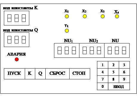 Пульт управления оператора: Пульт управления обеспечивает ввод в МПУ следующих значений: - 8-разрядной двоичной константы K; - ввод двоичного сигнала «СТОП»; - формирование сигнала начальной установки системы (RESET) - Пульт управления обеспечивает вывод из МПУ следующих значений: - на световую индикацию значений x1, x2, x3, x4, y1, y2, y3, NU1, y4. Необходимо предусмотреть светодиод зуммер аварийной сигнализации