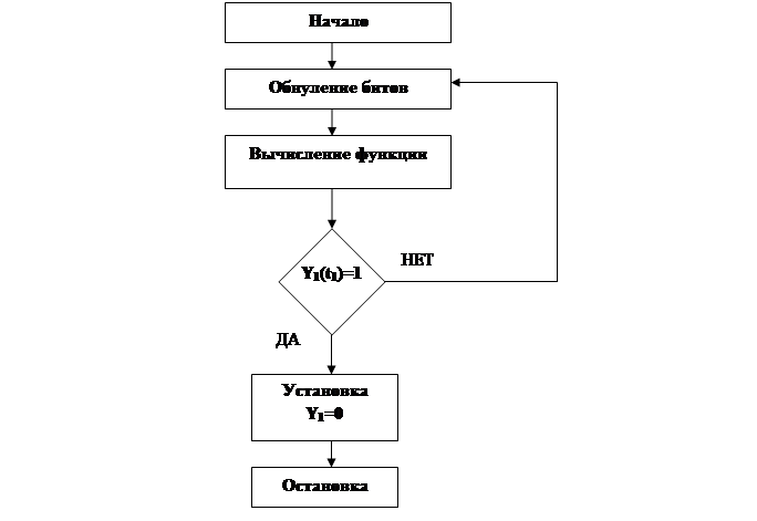 При единичном значении f1 вырабатывается управляющий сигнал y1 длительностью t1. Это означает, что через время t1 после выдачи y1 необходимо выработать y1=0. Блок-схема программы