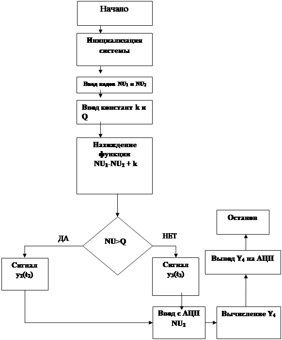 и значение Y4 в виде 8-разрядного кода выдается на вход АЦП. Все двоичные константы и переменные, участвующие в вычислениях NU1, NU2, k, Q, Y4 рассматриваются как целые без знака. Блок-схема программы