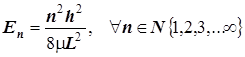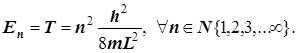 При описании состояний реальных систем в общем случае всегда возникает проблема определения коэффициентов Постулат 5. Средние значения динамических переменных: Его формулировка: Среднее значение динамической величины, полученное в результате многих измерений, равно математическому ожиданию этой величины, вычисленному с помощью её динамического оператора. Это утверждение на первый взгляд кажется простым следствием второго постулата, но это справедливо лишь для состояния “чистого”, волновая функция которого есть одна из простейших в спектре собственных функций динамического оператора. Для “смешанного” состояния волновая функция является уже суперпозицией более простых волновых функций, и этот постулат вводится как основание для вычислений усреднённых значений физических характеристик системы. Для подавляющего большинства реальных систем уравнение Шрёдингера имеет слишком сложный вид, и невозможно получить спектры его собственных волновых функций и собственных значений гамильтониана (энергетических уровней всех квантовых состояний) в аналитической форме в зависимости от квантовых чисел (номеров состояний-уровней). В силу этого расчёт свойств реальной системы почти всегда начинается с составления приближённой волновой функции для какого-то отдельно выбранного квантового состояния, а данный постулат предписывает способ вычисления наблюдаемой физической величины с помощью искусственно конструируемой волновой функции. В этом и состоит значение 5-го постулата. V. Уравнение Шрёдингера для простейших квантовомеханических систем. Общая схема и примеры составления и решения уравнения Шрёдингера. 1. Одномерный "потенциальный ящик" как простейшая модель замкнутого поступательного движения. Волновые функции, граничные условия и квантование энергии (энергетический спектр). Энергетическая диаграмма и графики волновых функций. Узлы и пучности волновых функций. Нормировка. Связь номера уровня с числом узлов и пучностей волновой функции - стоячей волны де Бройля. Области применения модели "потенциального ящика".