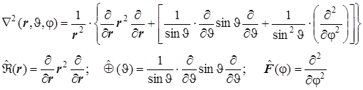 VII. Атом водорода и водородоподобные ионы в квантовой механике. Шаровые координаты (r, J, j). Одноэлектронный гамильтониан в шаровых координатах. Уравнение Шрёдингера для водородоподобного атома. Схема разделения переменных. Атомные орбитали, их радиальные и угловые компоненты: yn, l, m(r, J, j) = Rn, l(r). ql, m(J). Fm(j). Квантовые числа n, l, m, их взаимосвязь, пределы изменения и физический смысл. Квантование энергии, модуля и проекций момента импульса. Полярные диаграммы угловых компонент АО. Рабочие формулы: Лапласиан и его слагаемые в декартовых и шаровых координатах: