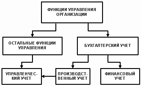 Рис. 1.1. Взаимосвязь между управленческим и финансовым учетом Управленческий учет исторически является следствием производственного учета. Производственный учет включает в себя, в основном, учетно-расчетные процедуры, основной целью которых является определение затрат и выручки на единицу продажи товаров. Производственный учет в розничной торговле призван следить за издержками обращения и доходами от продаж и выявлять возможные резервы повышения рентабельности производственно-хозяйственной деятельности. Он должен четко и детально отражать все процессы, связанные с приобретением и реализацией товаров на предприятии Управленческий же учет по своему составу безусловно шире, чем производственный, поскольку через функции управления он превращает производственный учет, по существу, в интегрированную систему внутрихозяйственного учета затратами и доходами организации. Исходя из этого возможно предложить следующую структуру управленческого учета (рис. 1.2).