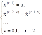 который содержит r+n неизвестных параметров Ci. Здесь r – число начальных, а n–число конечных условий; из этих условий однозначно определяются параметры полинома (3.11). Выбор полиномов в качестве класса функций, задающих требуемое движение объекта, имеет следующие преимущества. При любых линейных преобразованиях полином остается полиномом, изменяется только его степень. Его неизвестные параметры Ci определяются в результате решения алгебраических уравнений, кроме того, эти коэффициенты могут быть определены с помощью рекуррентных соотношений, приведенных ниже. Рассмотрим вначале простейший класс управляемых объектов – цепочку интеграторов r-го порядка. Этот объект замечателен тем, что его фазовыми координатами служат выходная функция и r-1 ее производных. Все соотношения, которые будут получены для цепочки интеграторов, найдут применение и для объектов произвольной структуры. Движение объекта, составленного из r последовательно включенных интеграторов, описывается следующей системой дифференциальных уравнений: