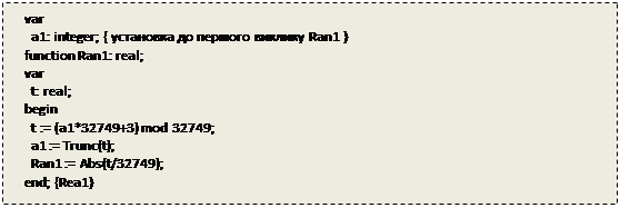 вимірюваньшуму лампи в моменти часу Послідовність квазірівномірних випадкових чисел за допомогою фізичного генерування утворюється спеціальними електронними приставками до ЕОМ — фізичними генераторами випадкових чисел. Для знаходження наступного випадкового числа РВП [0, 1] при проведенні машинних розрахунків досить один раз звернутися до цього пристрою. Переваги методу фізичного генерування: 1) швидкість здобування чисел надвисока (проміжок часу звертання до електронного пристрою ЕОМ дуже малий); 2) місця в оперативній пам’яті не займає; 3) запас чисел не обмежений. Недоліки методу фізичного генерування: 1) не можна повторити спроби (немає змоги фізичний датчик зафіксувати на певному випадковому числі); 2) потрібне періодичне коригування датчиків, оскільки фізичні властивості їх із часом змінюються; 3) необхідно мати спеціальний пристрій до ЕОМ. Фізичне генерування випадкових чисел використовується здебільшого там, де дуже часто розв’язуються задачі методом Монте-Карло. Проте останніми роками навіть за цих умов надається перевага програмним генераторам випадкових чисел. 1.3 Програмний спосіб При програмному способі наступне випадкове число