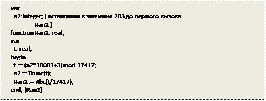 Відзначимо, що R - це попереднє число, а R - наступне. Даний метод інколи називають лінійним порівняльним методом. Формула така проста, що ви можете подумати, що генерувати випадкові числа просто. Проте, це пастка: наскільки добре працює дана формула, дуже сильно залежить від значення а, з і m. Вибір значень інколи більшою мірою мистецтво, ніж наука. Існують складні правила, які можуть допомогти вам вибрати значення; проте, ми розглянемо лише декілька простих правил і прикладів. Модуль (m) має бути досить великим, оскільки він визначає область випадкових чисел. Операція узяття по модулю породжує залишок від ділення числа на модуль. Отже, 10 по модулю 4 рівне 2. Таким чином, якщо модуль дорівнює 12, то формулою породжуються числа від 0 до 11, а якщо модуль дорівнює 21425, то породжуються числа від 0 до 21424. Вибір множника а і прирости з є дуже складним завданням. У загальному випадку множник може бути задоволений великим, а приріст - маленьким. Безліч спроб і перевірок необхідна, аби створити хороший генератор. Як перший приклад тут приведений один з найчастіше використовуваних генераторів випадкових чисел. Рівняння, показане в Rаn1 використовується як основа для генератора випадкових чисел у ряді популярних мов.