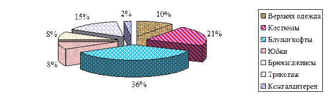 Рисунок 2 - SWOT -анализ магазина «Клеопатра» 3 Продукты Одной из главных характеристик товара (продукта) является ассортимент, который определяет принципиальные различия между товарами разных видов и наименований. Большое влияние на результаты хозяйственной деятельности оказывает ассортимент (номенклатура). Ассортимент товаров – это набор товаров, формируемый по определённым признакам и удовлетворяющий разнообразные, аналогичные и индивидуальные потребности. Планируемая структура видового ассортимента для нового магазина: - верхняя одежда -10%, - костюмы – 21%, - блузки/кофты – 36%, - юбки -8%, - брюки/джинсы – 8%, - трикотаж -15%, - кожгалантерея -2%.