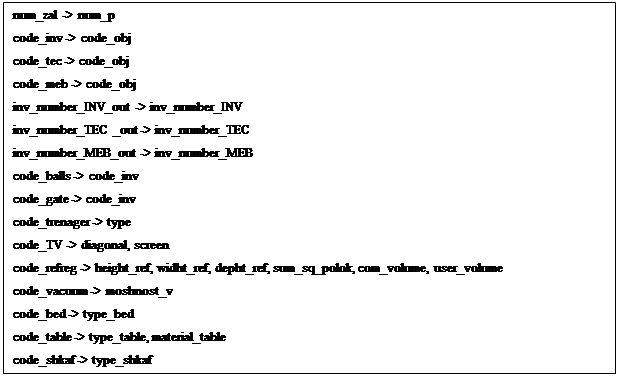 Рисунок 2.1 – Исходные функциональные зависимости 2.3.2 Функциональные зависимости сохраняющие иерархию В данном множестве есть следующие зависимости, которые сохраняют иерархию: Спортивным залом не может быть несуществующее помещение. num_zal -> num_p. Не поступавшая партия объектов не может быть зарегистрирована как инвентарь. code_inv -> code_obj. Не поступавшая партия объектов не может быть зарегистрирована как техника. code_tec -> code_obj. Не поступавшая партия объектов не может быть зарегистрирована как мебель. code_meb -> code_obj. Незарегистрированная единица инвентаря не может быть списана. inv_number_INV_out -> inv_number_INV. Незарегистрированная единица техники не может быть списана. inv_number_TEC _out -> inv_number_TEC. Незарегистрированная единица мебели не может быть списана. inv_number_MEB_out -> inv_number_MEB. Незарегистрированная партия инвентаря инвентаря не может быть партией мячей. code_balls -> code_inv. Одна и та же партия ворот не может поступить дважды. code_gate -> code_inv. Одна и та же партия тренажеров не может поступить дважды. code_trenager -> type. Одна и та же партия телевизоров не может поступить дважды. code_TV -> diagonal, screen. Одна и та же партия холодильников не может поступить дважды. code_refreg -> height_ref, widht_ref, depht_ref, sum_sq_polok, com_volume, user_volume. Функциональные зависимости сохраняющие иерархию представлены на рисунке 2.2.