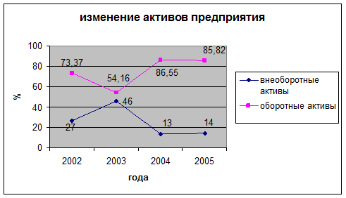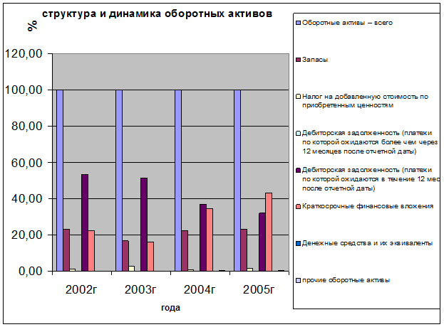 Рисунок 6. Структура и динамика оборотных активов Таким образом, общие изменения в структуре и динамике активов на ОАО “УФАКРАН” имеет общую тенденцию увеличения оборотных активов и резкий спад внеоборотных активов (спад произошел в 2003 году).