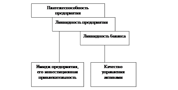 2.2.2 Оценка финансового положения Одним из показателей, характеризующих финансовую устойчивость предприятия, является его платежеспособность. Ведь именно платежеспособность является внешним проявлением финансового состояния предприятия, его устойчивости. Оценка платежеспособности внешним инвесторам осуществляется на основе характеристики ликвидности текущих активов. Взаимосвязь между платежеспособностью, ликвидностью предприятия и ликвидностью баланса можно представить в виде рисунка.