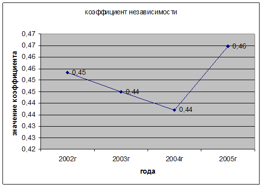 Рисунок 10. Изменение показателей ликвидности предприятия ОАО “УФАКРАН” По полученным данным можно сделать вывод о том, что наиболее тяжелым годом для ОАО “УФАКРАН” был 2003 год. Именно тогда КТЛ и ККЛ имеют минимальное значение, а также имеет место непокрытие оборотных активов над краткосрочными обязательствами. При этом за рассматриваемый период КАЛ превышает нормативный показатель. Следовательно, гарантия погашения долгов на предприятие ОАО “УФАКРАН” стабильно высока. Необходимо помнить, что КАЛ еще не является признаком плохой или хорошей платежеспособностью. При оценки ее уровня необходимо также учитывать скорость оборота средств в текущих активах и скорость оборота краткосрочных обязательств. Показатели финансовой независимости Оценивая финансовое положение предприятия ОАО “УФАКРАН”, необходимо рассчитать и проанализировать показатели финансовой независимости, т.е. оценить насколько предприятие зависит от внешних источников финансирования. Для анализа финансовой независимости необходимо рассчитать коэффициент независимости . КН