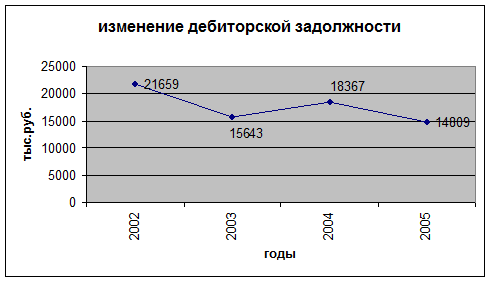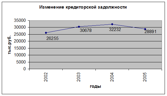 На данном предприятие изменение кредиторской задолжности имеет тенденцию спада лишь последний год. При этом с 2002 года по 2004 год кредиторская задолжность превышала дебиторскую. Изменение кредиторской задолжности за исследуемы период представлено на рисунке 14.