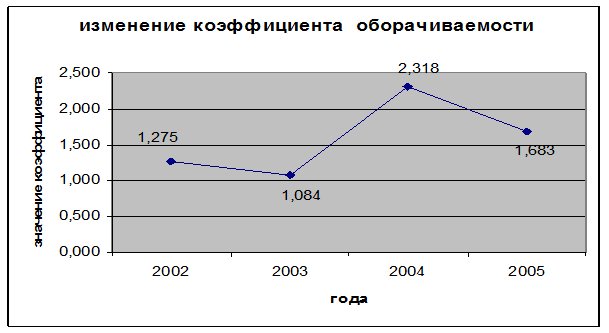 Расчет Ко = В/Оср, где Ко – коэффициент оборачиваемости, В – выручка от реализации, Оср – среднегодовые остатки оборотных средств Ко = 25870/20295,5=1,275 – 2002 год Тенденцию показателя оборачиваемости иллюстрирует рисунок: