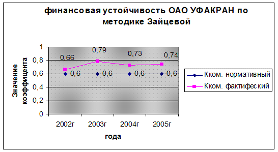 Рисунок. 16 Изменение коэффициента оборачиваемости на ОАО “УФАКРАН” В целом, на предприятие наблюдается тенденция скачкообразного изменения коэффициента оборачиваемости. Из рисунка видно, что в 2003 году произошло снижение оборачиваемости капитала. А в 2004 году произошел резкий скачок. Это произошло за счет изменения структуры капитала, в частности, увеличилась доля оборотного капитала в общей сумме и сокращения продолжительности оборота на 44 дня. Предприятие ОАО “УФАКРАН” имеет тенденцию к увеличению кредиторской задолжности, и снижению дебиторской задолжности. По этой причине за последнее время произошло снижение оборачиваемости капитала. Поэтому необходимо сопоставлять возможности предприятия с желаемым результатом. Хотя нельзя утверждать, что тенденция оборачиваемости капитала имеет тенденцию снижения. Возможно, 2004 год стал наиболее продуктивным в работе предприятия. Предложения по ускорению оборачиваемости капитала: 1.сокращение продолжительности производственного цикла за счет применения новых технологий, повышения производительности труда; 2.улучшение предприятия материально-технического снабжения; 3.сокращение времени нахождения средств в дебиторской задолжности; 4.ускорение процесса отгрузки продукции; 5.повышение уровня маркетинговых исследований. 2.2.2.7 Анализ финансовой устойчивости При анализе финансового состояния предприятия необходимо также оценить его финансовую устойчивость. Предприятие ОАО “УФАКРАН” можно считать финансово устойчивым, если покрывается не менее 50 % необходимых финансовых ресурсов. Для оценки финансовой устойчивости необходимо рассчитать показатели устойчивости предприятия. Расчет данных показателей приведен в таблице. Таблица 22 Динамика показателей оценки финансовой устойчивости организации ОАО “УФАКРАН”