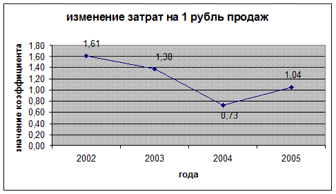 Предыдущая таблица анализирует состав и структуру расходов по обычным видам деятельности. Основная часть расходов ОАО “УФАКРАН” – материальные затраты. Но в 2005 году основной частью затрат является прочие затраты. Рассчитали коэффициент затрат на 1 рубль продаж: Кз/п = З – затраты общие, В – выручка. Пример расчета для 2002 года: Кз/п = 41685/25870=1,6 Изменение данного показателя иллюстрирует рисунок 21.