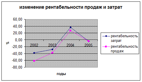 Рисунок 25 . Изменение прибыли на ОАО “УФАКРАН” Таким образом, прибыль на данном предприятии была положительной лишь в 2004 году, когда выручка от реализованной продукции превышала затраты. Соответственно, рентабельность продаж и затрат в годы, когда прибыль отрицательна, также является отрицательной. Изменение этих показателей иллюстрирует рисунок 23.