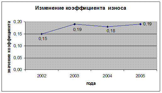Рисунок.33 Изменение коэффициента износа основных средств на предприятие. Таким образом, на ОАО “УФАКРАН” наблюдается тенденция роста коэффициента износа всех производственных фондов предприятия. В целом, состояние и возможности предприятия можно оценить, как удовлетворительные. Поскольку данное предприятие имеет положительную динамику развития, хотя использует свой потенциал не в полной мере. Переход к рыночной экономике требует от предприятий повышения эффективности производства, конкурентоспособности продукции. Важная роль в реализации этой задачи отводится экономическому анализу деятельности предприятия. С его помощью вырабатываются стратегия и тактика развития предприятия, обосновываются планы и управленческие решения, осуществляется контроль за их выполнением, выявляются резервы повышения эффективности производства, оцениваются результаты деятельности предприятия, его подразделений и работников. ОАО “Уфимский краностроительный завод” (“УФАКРАН”) является самостоятельным предприятием и единственным производителем в республике Башкортостан по изготовлению кранов козловых. Оценивая структуру и динамику оборотных активов, можно говорить о том, что дебиторская задолжность имеет тенденцию спада (53,47%-31,4%), в то время как краткосрочные финансовые вложения имеют тенденцию роста, запасы же находятся на относительно стабильном уровне (23% - среднее значение). В 2003 году запасы сократились до 16%. НДС имеет незначительные изменения в общей структуре оборотных активов. Степень финансового риска довольно велика, поскольку намного превышает нормативные значения. Наибольшая опасность была в 2004 году, когда коэффициент риска имел максимальное значение. В 2005 году наблюдается общее снижение данного показателя. Во многом это обуславливается снижением заемного капитала в общей структуре. Финансовое положение ОАО “УФАКРАН” находится на стабильно удовлетворительном уровне, не превышая нормативное значение. При этом имеет место зависимость предприятия от внешних источников финансирования. Анализ деловой активности ОАО “УФАКРАН” показал, что за исследуемый период предприятие имеет стабильную тенденцию медленного роста. Так, показатели ликвидности за данный период имеют общую тенденцию роста, и постепенно приближаются к нормативным. Более полный анализ данных показателей приведен в разделе Анализ ликвидности. В целом же, ОАО “УФАКРАН” находится на среднем уровне развития и функционирования. Показатели рентабельности предприятия в целом и активов в частности находятся на низком уровне. Поскольку чистая прибыль за исследуемый период мала, в 2003 году предприятие закончила год с убытком. Прирост активов предприятия имел положительную динамику в течение 3-х лет. В 2005 году произошло снижение активов на 3430 тыс.руб. В целом же, уровень запаса финансовой прочности превышает нормативный показатель 0,7 и показывает то, что ОАО “УФАКРАН” находится на стабильном уровне развития предприятия. ОАО “УФАКРАН” – предприятие, демонстрирующее некоторую степень риска по задолжности, но еще не рассматривается как рискованное. Список литературы: 1. Алексеева М. М. Планирование деятельности фирмы: Учебно-методическое пособие.- М.: Финансы и статистика, 2003. 2. Савицкая Г.В. Анализ хозяйственной деятельности предприятия:5-е изд./Г
