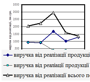 В структурі собівартості насіння соняшнику найбільшу питому вагу займають такі витрати: насіння та посадковий матеріал, паливо та мастильні матеріали, роботи та послуги, витрати на оплату праці. На протязі аналізованого періоду собівартість 1 ц соняшнику збільшилась майже в 3 рази, що пов’язано в основному із підвищенням цін на матеріали, насіння, а також тарифів. 2.3 Аналіз складу та динаміка виручки від реалізації продукції Виручка від реалізації продукції залежить від впливу таких чинників: 1). Обсяг реалізованої продукції; 2). Реалізаційна ціна; 3). Структура реалізованої продукції. Проаналізуємо динаміку від реалізації продукції згідно даних таблиці 2.12, з яких видно, що у 2004 році в основному зросли реалізаційні ціни на продукцію, що пояснюється інфляцією та ситуацією на ринку. Щодо обсягів реалізації можна зробити висновки, що у рослинництві вони по основним видам продукції зменшилися. В 2004році в порівнянні з 2000 роком, наприклад, зменшилась виручка від реалізації зернових на 4,53% , проте виручка від реалізації кукурудзи збільшилася в 2,7 рази за рахунок збільшення обсягу реалізації в 3,1 рази. Виручка від реалізації соняшнику зросла в 2,35 рази за рахунок збільшення реалізаційної ціни в 2,62 рази. . Взагалі, обсяг виручки від реалізації продукції рослинництва зріс на 40,1%. З продукції тваринництві в господарстві в звітному році виробляється та реалізовується тільки мед і складає 5 тис.грн. За рахунок цього зменшилася виручка від реалізації всього по господарству на 32,5 %. Більш наглядніше динаміку виручки від реалізації представлено на рисунку 2.1