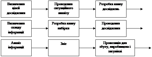 Рис. 1.2 Підсистеми маркетингової інформаційної системи Система маркетингових досліджень є однієї з найбільш складних, оскільки вимагає одержання інформації безпосередньо від споживачів, вибору найбільш ефективних методів одержання первинної інформації, а також кількісних методів обробки отриманої інформації Маркетингове дослідження - це систематична підготовка і проведення різних обстежень, аналіз отриманих даних і представлення результатів і висновків у вигляді, що відповідає конкретній маркетинговій задачі, що стоїть перед підприємством [20, c.221-222]. Існують три види цілей маркетингового дослідження [23, c.97]: · дослідницька - визначення проблеми, на вирішення якої варто направити маркетингову діяльність підприємства; · описова - опис і пояснення подій на ринку; · аналітична - спроба визначити причинно-наслідкові зв'язки між подіями на ринку. Цілі маркетингового дослідження, поставлені на конкретному підприємстві, визначають етапи дослідження (рис. 1.3)