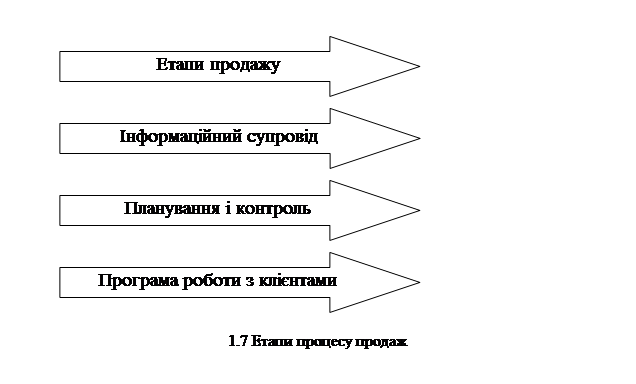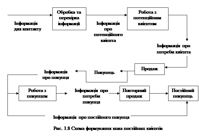 При цьому ефективність роботи фірми визначається збалансованістю всіх складових процесу продажу. Очевидно, що друга і третя складові забезпечуються за допомогою інформаційної системи підприємства, основу якої повинна складати клієнтська база. Проте, для кращого розуміння підходів розглянемо коротко етапи продажу, що передбачені в даному підході. Так, для відділів продажів більшості компаній, поряд зі збільшенням обсягів продажів, метою є формування кола постійних покупців. У виді схеми це можна відобразити в такий спосіб. (Рис. 1.8)