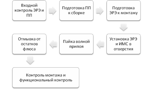 Рисунок 1 – Схема сборки с базовой деталью. Необходимо знать допускаемый уровень дефектности. Это условие надо учесть при определении параметров техпроцесса, и программа запуска при детальной разработке техпроцесса должна быть увеличена. Также необходимо разработать план контроля, позволяющий поддерживать уровень дефектности на заданном уровне. 3. ПОИСК АНАЛОГОВ И ПРОТОТИПА ИЗ ИЗВЕСТНЫХ ТЕХНОЛОГИЙ, ОБЕСПЕЧИВАЮЩИХ РЕШЕНИЕ КОНКРЕТНОЙ ТЕХНИЧЕСКОЙ ЗАДАЧИ В соответствии с требованиями ГОСТ 31109-82 при разработке техпроцессов сборки изделия ЭВС необходимо максимально использовать типовые технологические процессы. Типизация технологических процессов уменьшает объем технологической документации, сокращает объем работ по подготовке производства, позволяет вести разработку и применение групповых методов обработки, организации специализированных участков, применения поточных линий и средств автоматизации. В электронной промышленности существует шесть общих типов SMT сборки, каждому из которых соответствует свой порядок производства. При выборе типа сборки, основной целью должна быть минимизация числа операций, так как каждая операция может увеличивать промышленную стоимость. Существует специальный стандарт, в котором представлены основные виды сборок, разбитые по классам. · Тип 1 – монтируемые компоненты установлены только на верхнюю сторону или interconnecting structure · Тип 2 – монтируемые компоненты установлены на обе стороны платы или interconnecting structure · Класс А - только through-hole (монтируемые в отверстия) компоненты · Класс В - только поверхностно монтируемые компоненты (SMD) · Класс С - смешанная: монтируемые в отверстия и поверхностно монтируемы компоненты · Класс Х - комплексно-смешанная сборка: through-hole, SMD, fine pitch, BGA · КлассY - комплексно-смешаннаясборка: through-hole, surface mount, Ultra fine pitch, CSP · КлассZ - комплексно-смешаннаясборка: through-hole, Ultra fine pitch, COB, Flip Chip, TCP В разрабатываемом устройстве применяются только through-holeкомпоненты, причем устанавливаются они только на верхнюю сторону платы. Таким образом, тип сборки для устройства – 1А. Технологический процесс сборки ПП на основе THT-технологии состоит из следующих типовых этапов: · подготовка выводов ЭК (формовка, обрезка), часто совмещается с автоматизированным монтажом; · установка компонентов (ручная, автоматическая, полуавтоматическая); · пайка (волной припоя, ручная, селективная); · отмывка (ультразвуковая, струйная). Используем технологический процесс, состоящий из этих этапов, в качестве аналога. С учетом того, что производство является серийным, целесообразно применять средства механизации и автоматизации, так как это повышает производительность и качество производства. Таким образом, внесем уточнения в типовой технологический процесс и получим технологический процесс для разрабатываемого устройства. Схема этого техпроцесса представлена ниже на рисунке 2.