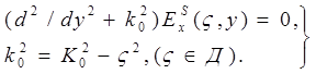 Здесь значок справа у неизвестной функции С другой стороны, при |y | £b существует разрыв в среде. В результате выполнения прямого преобразования Фурье в волновом уравнении (3) оно превращается в следующие дифференциальные уравнения неодинакового порядка: