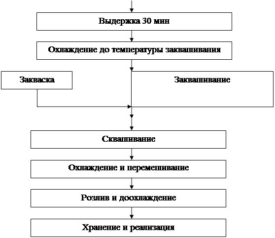 Рисунок 1 – Технологическая схема производства кисломолочного продукта «Бифилайф» Сырьё и материалы: Для производства кисломолочного продукта «Бифилайф» применяются следующее сырьё и основные материалы: молоко коровье заготовляемое не ниже 1 сорта, кислотностью не более 19°Т, плотностью не менее 1,028 гр/см3 ; закваска сухая «Бифилайф» по ТУ 9229-003-52381804-01,а также закваска, приготовленная на основе термофильного молочнокислого стрептококка по ТУ 10-02-02-789-65-91 в соответствии с технологической инструкцией по производству бактериальных заквасок, дрожжей и тест-культур [20]. Сухая закваска «Бифилайф» поступает на предприятие из Московского Научно-исследовательского института эпидемиологии и микробиологии имени Г. Н. Габричевского, на которую имеется сертификат соответствия, представленный в Приложении Б. Закваска из термофильного молочнокислого стрептококка готовится из сухой закваски и бактериального концентрата. Сухая бактериальная закваска поступает на предприятие от ГУП-ВНИМИ-Сибирь-РАСХН в сопровождении удостоверения о качестве, представленном в Приложении В. Приёмка молока: На предприятии молоко принимают по ГОСТ Р 52054-2003 «Молоко натуральное коровье – сырьё». Молоко принимают по массе и качеству, установленному лабораторией предприятия. Молоко должно быть без извлечений и добавок молочных и немолочных компонентов подвергнутое первичной обработке (очистке от механических примесей и охлаждённое до температуры 4±2°С после дойки) и предназначено для дальнейшей переработки. Приёмка молоко сопровождается предоставлением сопроводительной документации: товарно-транспортная накладная, ветеринарное свидетельство и протоколы испытаний показателей безопасности. Приёмка молока-сырья включает следующие процедуры: - предоставление документов, сопровождающих партию молока-сырья; - отбор проб; - измерение показателей качества; - оформление удостоверения качества и безопасности. На выработку используют молоко не ниже I сорта. Требования к показателям качества и безопасности молока-сырья при приёмке на предприятие представлены в таблице 5. Таблица 5 – Показатели качества и безопасности молока-сырья