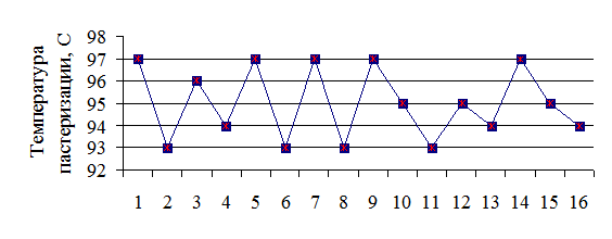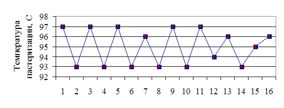 Измерение температуры пастеризации происходило в течение 5 опытов через каждые 5 минут. Продолжительность пастеризации молока составляет 1 час 20 минут. Х1 , х2 , х3 ,…,х16 – замеры температур через каждые 5 минут. Данные результатов измерений представлены в таблице 14. Таблица 14 – Контроль температуры пастеризации