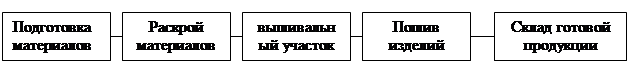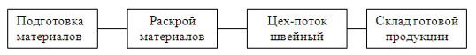 6. Расчет общей площади предприятия: Fобщ. = Fпр. + Fвсп. = 819 + 81,9 = 900,9 м². 7. Выбор общей схемы поэтажной планировки. Выбор схемы поэтажной планировки технологического процесса заключается в размещении производственных цехов и подсобно-вспомогательных помещений. Одновременно с этим решают схему грузопотока (ввоз ткани; направления движения ткани в подготовительном цехе; ткани и кроя в раскройном цехе; кроя полуфабрикатов и готовой продукции в швейных цехах). Схема поэтажной планировки – это схема, показывающая поэтажное расположение цехов, участков и взаимосвязь между участками, а так же правильность и не пересеченность людского и грузовых потоков. В курсовом проекте выбрана схема производства с применением цеха потока (сквозного потока) технологическим процессом на швейном участке. В ее состав входят следующие цеха: подготовительный, экспериментальный, раскройный, швейный, отделочный склад готовой продукции. Для проектируемого предприятия выбрана схема производства рис.2.3