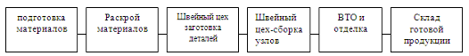 2. ЭТАПЫ ПРОМЫШЛЕННОГО ПРОЕКТИРОВАНИЯ 2.1 ТЕХНИЧЕСКОЕ ЗАДАНИЕ. ВЫБОР СХЕМЫ ПРОИЗВОДСТВА И ГРУЗОПОТОКОВ В общем случае принято разделять схемы производства: с законченным технологическим процессом на швейном участке; с незаконченным технологическим процессом на швейном участке. В первом случае в состав схемы производства входят следующие участки или цехи: подготовительный, раскройный, швейный, склад готовой продукции. Во втором случае из швейного участка выделяется отделочный участок: например, при производстве курток для определенных организаций это могут быть вышивальный цех (вышивка логотипов на кокетках, рукавах, карманах, изготовление шевронов) и печатный цех (печать логотипов на ткани с помощью трафаретов), а при изготовлении одежды из суконных тканей – это цех влажно-тепловой обработки и окончательной отделки. Структурную схему можно представить следующим образом рис. 2.1: А) с законченным технологическим процессом: