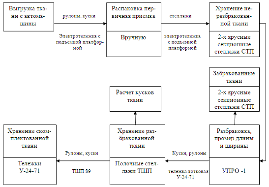 4. РАЗРАБОТКА ТЕХНИЧЕСКОГО ПРОЕКТА ПОДГОТОВИТЕЛЬНОГО ЦЕХА 4.1 ПРЕДПРОЕКТНЫЕ ИССЛЕДОВАНИЯ Подготовительное производство является важным звеном в технологическом процессе изготовления швейных изделий. Основные функции его сводятся к приему материалов по качеству и количеству, подготовке материалов к раскрою (промер длины и ширины, отметка на полотне текстильных дефектов), расчету кусков для использования их с минимальными остатками, подбору кусков для раскроя и передача их в раскройный цех, оформление документации. В подготовительном цехе проводится также статистический анализ качества поступающих с различных предприятий материалов. Расчет подготовительного цеха производят по периоду с наибольшим расходом материалов, если выпуск изделий изменяется по сезонам. Исходными данными для расчета являются: суточная потребность в материалах, пог.м; запас материалов в цехе, в днях работы предприятия; нормы времени (выработки) рабочих по операциям; габариты кусков, кип материалов. Для выполнения технологических расчетов необходимо выбрать: Организационную структуру подготовительного цеха; Транспортные средства участков подготовительного цеха; Способ хранения в зоне распаковки и приемки кип ткани; Способ размещения материалов в зоне хранения распакованных кусков материалов; Способ размещения материалов в зоне хранения разбракованных материалов; Способ расчета кусков материалов в настилы. 4.1.1 ВЫБОР И ОБОСНОВАНИЕ ТЕХНИКИ, ТЕХНОЛОГИИ И ОРГАНИЗАЦИИ ПРОИЗВОДСТВА На действующем предприятии ЗАО «Стел» организация работы подготовительного цеха с указанием путей движения материалов, применяемого оборудования и способ хранения тканей представлена на схеме 4.1.