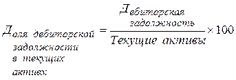 Период погашения дебиторской задолженности = 360:5,42 и составляет 66,4 дня на начало года, 360:4,76=75,6 дней на конец года, по сравнению с прошлым годом срок погашения уменьшился. Следует иметь в виду, что чем больше период просрочки задолженности, тем выше риск её непогашения. По нашим данным период просрочки задолженности не так велик, разница между концом и началом года составляет 10 дней, следовательно, предприятие раньше получит свою задолженность и может использовать ее в обороте. 3. Расчет доли дебиторской задолженности в общем текущих активов :