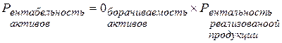 Рентабельность реализованной продукции = (4823:68220) х 100 равна 7,07% на конец отчетного года и (9670:59971) х 100= 16,1% на начало года. Значение этого коэффициента показывает, какую прибыль имеет предприятие с каждого тенге реализованной продукции. Из данных расчетов мы видим, что идет тенденция к его снижению, что позволяет предположить сокращение спроса на продукцию предприятия. Снижение коэффициента рентабельности реализованной продукции может быть вызвано также изменениями в структуре реализации, снижение индивидуальной рентабельности изделий, входящих в реализованную продукцию. Существует взаимосвязь между показателями рентабельности активов (имущества), оборачиваемостью активов и рентабельностью реализованной продукции, которая может быть представлена в виде формулы: