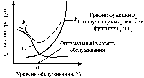 Рисунок 4. График зависимости потерь, вызванных ухудшением обслуживания, от величины уровня обслуживания Таким образом, рост конкурентоспособности компании, вызванный ростом уровня обслуживания, сопровождается, с одной стороны, снижением потерь на рынке, а с другой повышением расходов на сервис. Задача логистической службы заключается в поиске оптимальной величины уровня обслуживания. Графически оптимальный размер уровня сервиса можно определить, построив суммарную кривую F, отражающую поведение затрат и потерь в зависимости от изменения уровня обслуживания (рис.5).