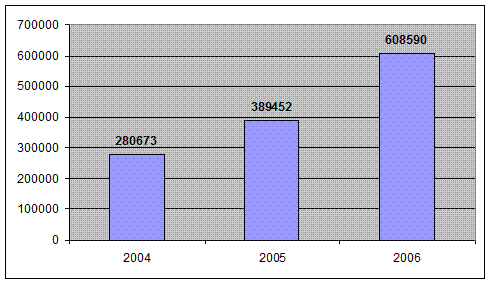 Рис.3.2. Реальная организационная структура ООО « СПК « Дальтехнострой» Многие должности на предприятии совмещены. Так первый заместитель по мимо своих обязанностей выполняет еще и функции заместителя по АХЧ, заместителя по экономической безопасности. Его функции: - аналитический обзор логистики поставок. - контроль за своевременностью поставок и организацией выгрузки. - сохранение коммерческой тайны. - контроль за степенью загрузки транспортных средств, недопущение простоев транспорта. - контроль за товарооборотом, анализ факторов, влияющих на товарооборот. - контроль за соответствием находящихся в разработке и введенных в действие объектов проектной и конструкторской документации. - организация взаимодействия между конструкторским бюро и строительной компанией. - выполнение функций главного инженера. - визирование документов. При проведении анализа хозяйственных предприятия было выявлено, что объемы услуг, оказываемые данной компанией за последние три года значительно увеличилась. Так в 2004 году прибыль от реализации услуг составила 280673 рубля, в 2005 – 389452 рубля, 2006 - 608590 рублей. Наглядно это показано на рисунке 3.3.