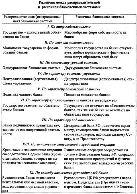 В противоположность распределительной системе банковская система рыночного типа характеризуется отсутствием монополии государства на банки. Каждый субъект воспроизводства самой разнообразной формы собственности (не только государственной) может образовать банк. В рыночном хозяйстве функционирует множественность банков с децентрализованной системой управления. Эмиссионные и кредитные функции разделены ими между собой. Эмиссия сосредоточена в центральном банке, кредитование предприятий и населения осуществляют различные деловые банки - коммерческие, инвестиционные, инновационные, ипотечные, сберегательные и др. Деловые банки не отвечают по обязательствам государства, так же как государство не отвечает по обязательствам деловых банков; деловые банки подчиняются своему Совету, решению акционеров, а не административному органу государства /4/.