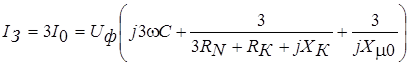 Рис.3. Схема замещения трансформатора для токов нулевой последовательности. Токи в фазах трансформатора резистивного заземления нейтрали со стороны его высшего напряжения должны находиться с учетом схем замещения трансформатора для прямой и обратной последовательностей. Так как по отношению к токам прямой (и обратной) последовательности вторичная обмотки является разомкнутой, схема замещения содержит только ветвь намагничивания На рис.5. представлена схема замещения для режима ОЗЗ при использовании общепринятых допущений о возможности пренебрежения величиной продольных сопротивлений в схемах замещения линий распределительной сети и сопротивлениями короткого замыкания трансформатора. Векторная диаграмма фазных токов трансформатора на стороне обмотки высшего напряжения представлена на Рис.6. На диаграмме в общем случае учтена активная составляющая в токе намагничивания прямой последовательности. При определении тока наиболее загруженной фазы трансформатора можно приближенно положить, что токи фазы "а" трансформатора прямой и нулевой и нулевой последовательности лежат на одной прямой. Тогда максимальный ток равен
