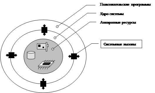 Рис 1.1 В центре находятся аппаратные ресурсы компьютера с которыми непосредственно взаимодействует ядро операционной системы изолируя прикладные программы пользователя от особенностей аппаратной архитектуры. Ядро имеет определенный минимальный набор услуг представляемых прикладным программам. В первую очередь это операции ввода-вывода (открытие, закрытие, чтение, запись и управление файлами), создание и управление процессами, организация синхронизации и обмена данными между процессами, управление памятью (реальной и виртуальной). Второй важнейшей функцией выполняемой ядром является защита операционной системы от разрушения со стороны пользовательских программ и реализация механизмов защиты данных в многопользовательской среде. Все пользовательские приложения пользуются услугами ядра посредством системных вызовов. На втором уровне находятся приложения, как пользовательские, обеспечивающие интерфейс с пользователем так и системные, управляющие работой системы. Несмотря на различные выполняемые задачи, схемы их взаимодействия с ядром одинаковы. Задачи выполняемые ядром операционной системыОстановимся более подробно на структуре ядра операционной системы. Функционально его можно представить состоящим из трех основных подсистем: подсистемы управления процессами и памятью, подсистемы ввода-вывода и файловой подсистемы. Все современные микропроцессоры поддерживают виртуальную память, защищенный и многозадачный режим работы. Последний подразумевает выделение кванта процессорного времени определенной задачи с последующим переключением на другую задачу Каждая задача имеет идентификатор уровня защиты, некоторые команды из системы команд процессора могут выполняться на любом уровне защиты, но есть привелигированные команды выполнение которых возможно лишь задачей имеющей нулевой уровень привилегии. Ядро операционной системы работает на нулевом уровне защиты, только оно имеет непосредственный доступ к физической памяти, системным регистрам процессора и портам ввода вывода. Пользовательские программы общаются с ядром посредством системных вызовов, представляющих собой команду приводящую к переключению процесса в контекст ядра, передачей параметров ядру. Затем ядро проверяет корректность параметров, права пользовательского процесса на возможность выполнения данного системного вызова и лишь после этого переходит к непосредственному выполнению всех низкоуровневых действий необходимых для исполнения пользовательского запроса. Благодаря этому достигается защита критически важных данных ядра от случайного или преднамеренного разрушения со стороны пользователя. Второй из важнейших функций ядра является обработка исключительных ситуаций возникающих в результате работы операционной системы и представляющим собой програмные прерывания. К последним относятся ошибки защиты (на пример попытка прикладной программы получить доступ к портам ввода-вывода или чужой области памяти), ошибки в работе оборудования, а также системные события возникающие при нормальной работе операционной системы. Некоторые из исключительных ситуаций приводят к аварийному завершению системы (ошибки оборудования или исключительная ситуация возникшая во время обработки исключительной ситуации), некоторые к ава