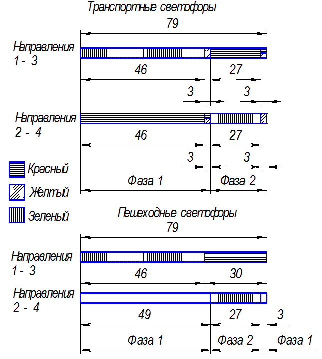 Так как степень опасности m > 150, то перекрёсток считается очень сложным. 6. Структура светофорного цикла В рассматриваемом направлении установлены пешеходные и транспортные светофоры. Работают они в следующем режиме. Транспортные светофоры. Разрешающий сигнал для направления 2 включается одновременно на 2-х светофорах – основном и дублирующем. Также включается и дублируется разрешающий сигнал для направления 4. Так как на рассматриваемом направлении отсутствуют дополнительные секции, то движение разрешается в любом направлении. Разрешающий сигнал для направления 2-4 включен на протяжении 27 секунд. Затем включается желтый сигнал светофора, продолжительностью 3 секунды. После него включается запрещающий сигнал светофора. Время работы сигнала – 46 секунд. Далее на 3 секунды включаются красный и желтый сигнал светофоров. После этого – опять зеленый. Цикл замкнулся. Итого суммарное время цикла – 79 секунд. Пешеходные светофоры. Разрешающий сигнал включается одновременно с разрешающим сигналом транспортного направления. Горит на протяжении 27 секунд. После включается запрещающий сигнал, одновременно с желтым сигналом транспортного светофора. Время работы запрещающего сигнала – 49 секунд. Так же пешеходные светофоры оборудованы счетчиком времени, который указывает на оставшееся время, в течении которого будет работать разрешающий сигнал. Схема циклов работы транспортного и пешеходного светофоров показана на рисунке 6.