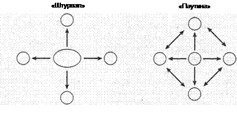 персонал и технология производства Рис.3. Детерминанты коммуникации в организации. 2.4.Структура коммуникации в организации. В результате изучения коммуникативных структур организации были выявлены следующие коммуникативные элементы и соответствующие им социально-психологические роли (позиции) участников коммуникативного процесса (рис. 4): -«секретарь», «сторож»,т. е. человек, осуществляющий в коммуникативной сети (как своеобразный фильтр) контроль объема передаваемой информации от одного элемента к другому («цепь» и «кольцо»); -«диспетчер»,или «информационный лидер», т. е. человек, распределяющий информацию по сетям («штурвал», «паутина»); -«связной»,или «мостик»,т. е. человек, связывающий, например, одну малую группу с другой, одно подразделение с другим; такие люди создают коммуникативную целостность организации («паутина»); -«лидер мнений»— человек, оказывающий заметное влияние на поведение и формирование отношения персонала к факторам производства («штурвал»); -«космополит» — человек, который чаще и активнее других взаимодействует с внешней средой организации.