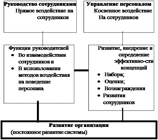 Речь идет о концепции, ориентирующей предпринимателя на достижение долгосрочных целей фирмы, исходя из которых формируется политика в отношении найма персонала, его оценки, вознаграждения, развития и мотивации труда. При этом учитываются условия, в которых действует фирма. Речь идет о внутренних и внешних факторах , которые оказывают влияние на деятельность фирмы. К внутренним факторам в отечественной литературе относят обычно: · цели фирмы; · стиль работы на фирме; · характер задач, стоящих перед фирмой; · отношения между людьми в группах; · стиь и опыт руководителя. К внешним факторам воздействия относятся: · профсоюзы; · правительственное регулирование и законодательство; · экономические условия (в том числе - конкуренция); · структурный состав рабочей силы в стране; · местоположение предприятия[37] . В таком случае кадровая политика включает четыре блока показателей: I. Направления деятельности служб управления персоналом: · обеспечение равных возможностей эффективного труда; · анализ рабочих мест; · планирование рабочих мест; · набор персонала; · отбор кадров; · оценка результативности труда; · обучение и повышение квалификации персонала; · планирование карьеры и перемещений по службе; · оплата труда; · назначение пособий и услуги; · обеспечение трудовой дисциплины; · трудовые отношения; · обеспечение безопасных и здоровых условий труда; · установление режима работ; · оценка работников. II. Личные характеристики работников: · способности; · образ мышления и склонности; · предпочтения; · рабочие интересы и мотивации; · личностные качества работника. III. Оценочные критерии эффективности кадровой политики: · результативность труда; · соблюдение законодательства; · удовлетворенность трудом; · наличие прогулов; · текучесть кадров; · наличие трудовых конфликтов; · наличие жалоб; · частота рабочего травматизма. IV. Результаты кадровой политики: конечные результаты деятельности предприятия: - конкурентоспособность продукции; - конкурентоспособность услуг. Все перечисленные внешние и внутренние факторы влияют на особенности стратегического менеджмента персонала в современной России. Вероятно, наибольшее влияние в настоящее время оказывают: - изменяющиеся общественные ценности, установки, отношения, ожидания и нравы, то есть, социальные факторы; - экономическая ситуация в стране; - политическая обстановка и изменяющаяся правовая среда; - возрастающая конкуренция, как внутренняя, так и внешняя. Для я уяснения сущности стратегического управления персоналом целесообразно привести мнение швейцарского ученого М. Ортига, который различает: руководство сотрудниками (прямое воздействие на персонал), управление персоналом (косвенное воздействие на занятых), развитие организации (постоянное развитие системы). Все три управленческие функции можно объединить в единую концепцию управления. Схематично это представлено на схеме 4. Схема 4.