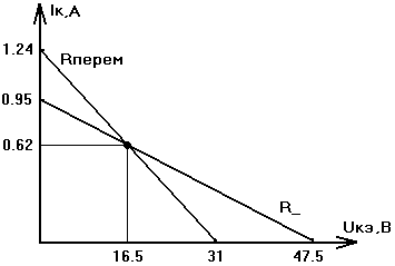 Uкэ0 =Uвых +Uостаточное =16.5В, (2.3) Iк0 =1.1*Iтр =0.62А. Напряжение Uкэ0 получено при условии, что величина напряжения Uостаточное , находящаяся в пределах от 2В до 4В, имеет значение 2.4В. Напряжение источника питания при этом: Еип =Uкэ0 +Rк *Iк0 =16.5В+50*0.62В=47.5В. (2.4) Видно, что напряжение питания достаточно высокое. Нагрузочные прямые по постоянному и переменному току приведены на рисунке 2.2.