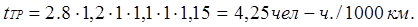 где Tтр н - величина норматива трудоемкости одного ТР чел-ч. на 1000 км. Принимаем: tТР Н =2,8 чел-ч. (Табл., 2.2 стр. 15 [7]) К1 =1,2 (Табл., 2.8 стр. 26 [7]) К2 =1 (Табл., 2.9 стр. 27 [7]) К3 =1,1 (Табл., 2.10 стр. 27 [7]) К4 =1 (Табл., 2.11 стр. 28 [7]) К5 =1,15 (Табл., 2.12 стр. 29[7])