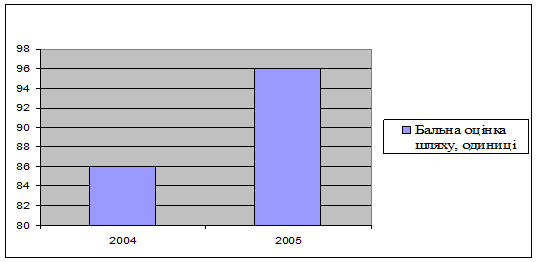 Рис. 2.2 Бальна оцінка колії, одиниць Таким чином діяльність дистанції колії можна охарактеризувати як задовільно. Але незважаючи на зменшення експлуатаційних витрат, якість утримання колії по бальній оцінці збільшилась, також зросла продуктивність праці. Фінансовий стан підприємства залежить від доцільності й правильності вкладення фінансових ресурсів в активи. У процесі функціонування підприємства величина активів і їхня структура постійно змінюється. Характеристику про якісні зміни в структурі майна і їхніх джерел можна одержати за допомогою вертикального й горизонтального аналізу звітності (додаток 14). За даними таблиці Вертикального та горизонтального аналізу підприємства (див. додаток 14) можна зробити висновки, що при наявності позитивних більше негативних рис, які є в балансі, а саме: ¾ сума основних засобів зросла на 1559,9 тисяч гривень; ¾ зменшилась доля виробничих запасів у складі оборотних активів з 99,18% до 73,97%; ¾ темп зростання статуного капіталу склав 99,98%; ¾ непокритий збиток виріс на 2112,2 тисячі гривень; ¾ сума розрахунків з оплати праці зросла з 16 тисяч гривень до 95 тисяч гривень; ¾ темп приросту розрахунків з поточними зобов’язаннями склав 40,82%. 2.3. Аналіз витрат основної діяльності дистанції колії До експлуатаційних витрат дистанції колії відносять витрати на обслуговування і поточне утримання засобів колійного господарства, а також на заміну зношеного інструмента, інвентарю й устаткування. Для повного аналізу експлуатаційні витрати поділяють на виробничі й адміністративні витрати. До складу виробничих витрат включаються: ¾ витрати на управління виробництвом (оплата праці апарату управління цехами, дільницями тощо; відрахування на соціальні заходи і медичне страхування апарату управління цехами, дільницями; витрати на оплату службових відряджень персоналу цехів, дільниць тощо); ¾ амортизація основних засобів, необоротних матеріальних активів та нематеріальних активів загальновиробничого (цехового, дільничого, лінійного) призначення; ¾ витрати на утримання, експлуатацію та ремонт, страхування, операційну оренду основних засобів, інших необоротних активів загальновиробничого призначення; ¾ витрати на вдосконалення технології і організації виробництва (оплата праці та відрахування на соціальні заходи працівників, зайнятих удосконаленням технології та організації виробництва, поліпшенням якості продукції, підвищенням її надійності, довговічності, інших експлуатаційних характеристик у виробничому процесі; витрати матеріалів, купівельних комплектуючих виробів і напівфабрикатів, оплата послуг сторонніх організацій тощо); ¾ витрати на опалення, освітлення, водопостачання, водовідведення та інше утримання виробничих приміщень; ¾ витрати на обслуговування виробничого процесу (оплата праці загальновиробничого персоналу; відрахування на соціальні заходи, медичне страхування робітників та апарату управління виробництвом; витрати на здійснення технологічного контролю за виробничими процесами та якістю продукції, робіт, послуг); ¾ витрати на охорону праці, техніку безпеки і охорону навколишнього природного середовища; ¾ інші витрати (внутрішньозаводське переміщення матеріалів, деталей, напівфабрикатів, інструментів зі складів до цехів і готової продукції на склади; нестачі незавершеног