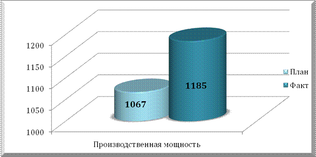 Рис. 20 – Производственная мощность (тыс. руб.) Мощность ср.годовая = (1067 +1185) /2 = 1126 тыс.руб. Вывод: Из данных баланса производственной мощности видно, предприятие использует производственную мощность на 49,1%. Причинами недоиспользования мощности могут быть: непропорциональный ввод и выбытие мощности в течении года, не достаточный объем производства в тыс.м2 . В данном случае для устранения причин не полного использования мощности требуется изучения использования отдельных видов машин и оборудования. Для характеристики степени использования пассивной части основных средств рассчитывают показатель выхода продукции на м2 производственной площади, который дополняет характеристику использования производственных мощностей предприятия. Его повышение способствует увеличению производства продукции и снижению ее себестоимости. Так по плану на предприятии выход продукции на 1м производственной площади составляет 0,2466 тыс.руб. по факту же выход продукции ниже на 0,01 тыс.руб., что свидетельствует о не полном использовании пассивной части основных средств. Таблица 15 Данные для анализа использования производственной площади предприятия