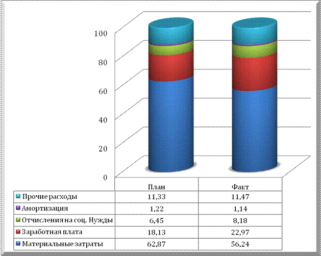 Рис.22 - Состояние запасов материальных ресурсов 2.5. АНАЛИЗ ОБЩЕЙ СУММЫ ЗАТРАТ НА ПРОИЗВОДСТВО ПРОДУКЦИИПланирование и учет себестоимостити на предприятии ведут по элементам затрат и калькуляционным статьям расходов. Элементы затрат: 1. материальные затраты (сырье, материалы, покупные комплектующие изделия и полуфабрикаты, топливо, электроэнергия и т.д.); 2. затраты на оплату труда; 3. отчисления на социальные нужды; 4. амортизация основных средств; 5. прочие затраты (износ НМА, арендная плата, обязательные страховые платежи, проценты по кредитам банка, налоги, включаемые в себестоимость продукции, отчисления во внебюджетные фонды и др.). Таблица 20Анализ затрат на производство продукции