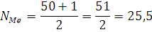 Медиана – значение признака, лежащее в середине упорядоченного ряда распределения. Номер медианы определяется по формуле: