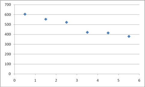 Проведем аналитические группировки продаваемых автомобилей по времени эксплуатации и пробегу и определим групповые средние. Построим график Y(X1 )