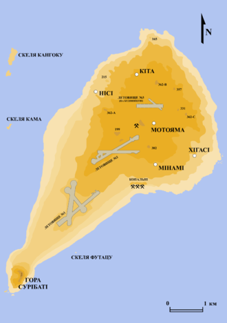 Карта острова Іодзіма. На півдні, на краю видовженого півострова, знаходиться гора Сурібаті, по центру летовище Мотояма, а на півночі поселення Кіта.