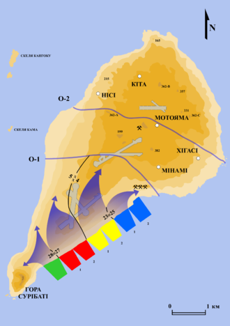 - Коли сил противника, що висадилися, заглибляться на територію острова до 500 м, японські підрозділи у околицях летовища Мотояма відкривають по ньому прицільний вогонь. Водночас, артилерія Мотоями бере під обстріл північний берег, а гармати Сурібаті — південний берег Іодзіми. [5]